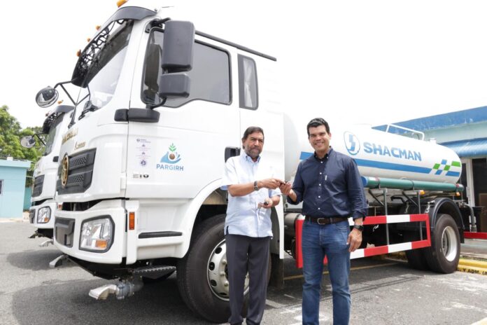 El director ejecutivo del Instituto Nacional de Aguas Potables y Alcantarillados (INAPA), Wellington Arnaud, recibió dos camiones cisterna de manos del director ejecutivo del Instituto Nacional de Recursos Hidráulicos (Indrhi), Olmedo Caba, para suplir de agua potable territorios que forman parte del Proyecto Agricultura Resiliente y Gestión Integrada de los Recursos Hídricos en las Cuencas Hidrográficas Yaque del Norte y Ozama-Isabela (PARGIRH).