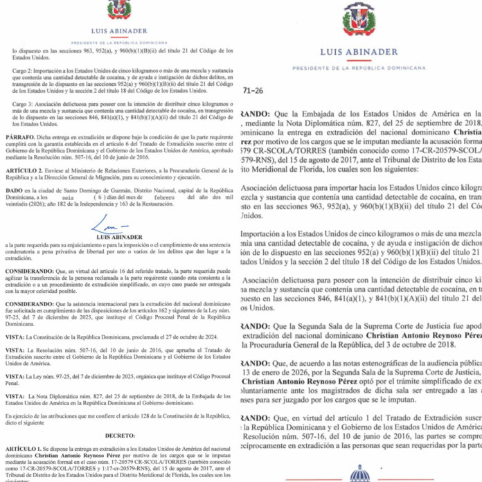 El Poder Ejecutivo emitió los decretos No. 69-26, 70-26 y 71-26 que disponen la entrega en extradición de los ciudadanos dominicanos Luis Manuel Febles Peralta y Christian Antonio Reynoso Pérez hacia los Estados Unidos de América, y del nacional polaco Szymon Tomkiel hacia la República de Polonia.