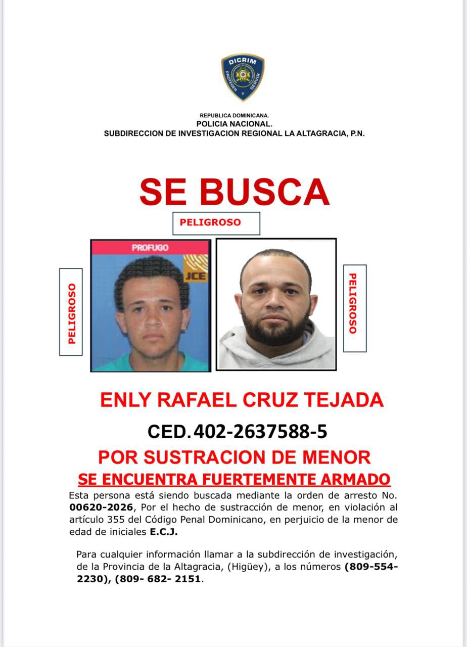 En el operativo fueron arrestados Ricardo José Sánchez Brito, de 23 años, y Laura Elizabeth Brito Báez, de 50 años, ambos detenidos mediante orden de arresto No. 00594-2026. Asimismo, es señalado como presunto responsable directo de la sustracción el nombrado Enly Rafael Cruz Tejada, alias “TiTi”, de 30 años, quien se encuentra prófugo.