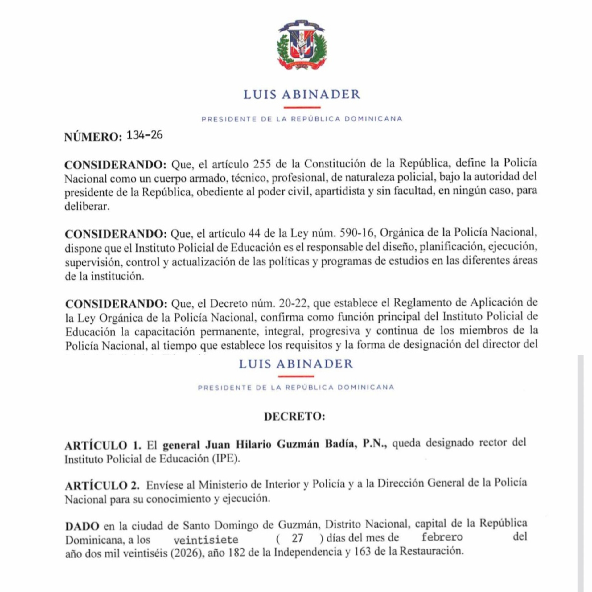 El presidente de la República, Luis Abinader, emitió el Decreto núm. 133-26 mediante el cual designa al general Esteban Figuereo García como subdirector general de la Policía Nacional y al general Ernesto Rafael Rodríguez García como inspector general de la institución, además de disponer ascensos, retiros y nuevas designaciones en la estructura policial.