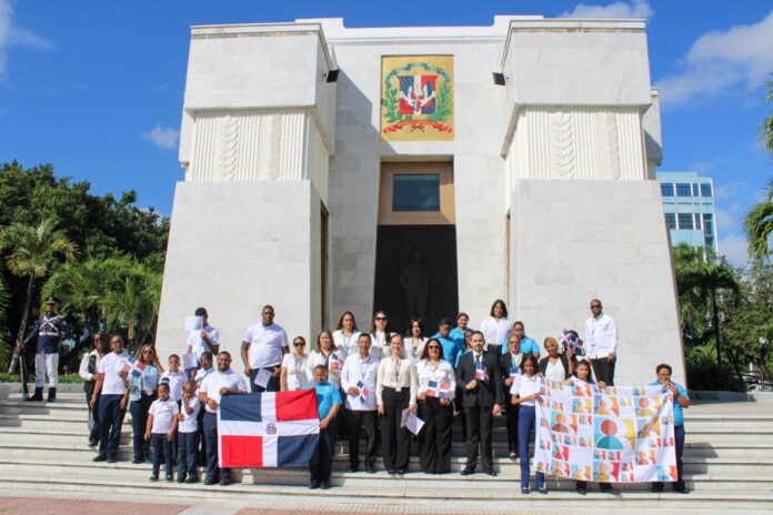Posteriormente, los edecanes entregaron la bandera dominicana a la directora general, quien a su vez la pasó al alumno Jesús Cuello, simbolizando la continuidad del compromiso patriótico entre generaciones.